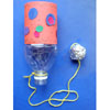 Cut the bottom of a small plastic bottle. Cut a strip of craft paper that fits around the bottle. Decorate with stickers, craft paper, etc. Add glue to the bottle and wrap craft paper strip around the bottle. Let dry. Tie a string of yarn to the bottle neck. Take a piece of heavy duty aluminum foil and place yarn on top. Form aluminum foil into a ball.