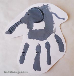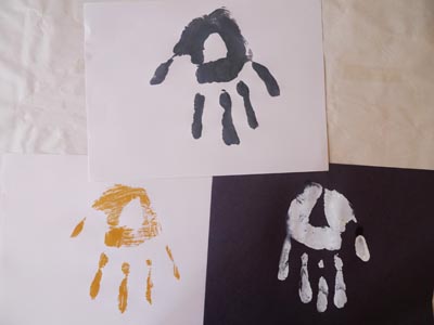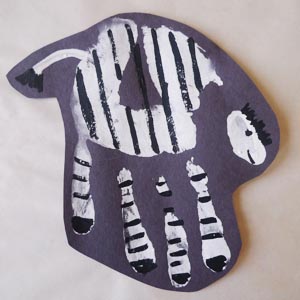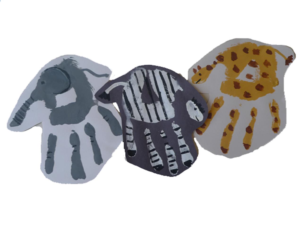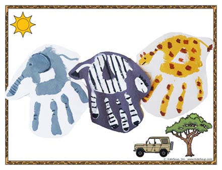 Over a period of three days, have children make three safari handprint animals on white construction paper. For each animal, have child paint hand in the suggested color and make a print on the paper.
