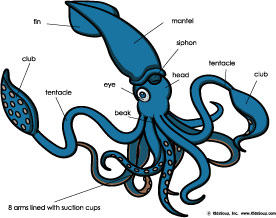 Print, cut out, and assemble the Squid Anatomy Poster. Post it in an area where children can easily view the diagram during circle time. Prepare one “squid body” per child by cutting the tops from large soda bottles and lining the cut edges with blue or white duct tape to protect fingers from the sharp plastic. Recycle the bottle bottoms.