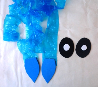 Give each child two blue streamers cut a bit longer than the bubble wrap strands. Show children how to cut shapes from blue craft foam to make their squids’ clubs. Have them glue the clubs to the ends of their blue streamers to make their squids' tentacles. Then, have children cut circles from the white and black craft foam to make their squids’ eyes.