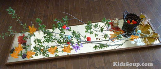 For play materials we provided real leaves, silk leaves, acorns, pom-poms, silk flowers, foam snowflakes, a basket, and some toy animals that live in and around trees (squirrels, birds, hedgehogs).