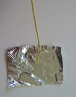 5. Rip a piece of aluminum foil and cut in half. Place a piece of yarn inside each piece(see pic3.)