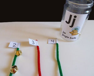 Fill an empty plastic jar with jingle bells. Label pipe cleaners with the numbers 1-10. Invite children to string the matching numbers of jingle bells on each pipe cleaner.