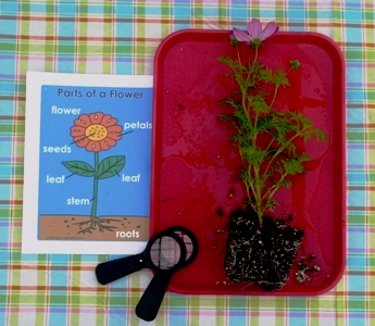 Place the unpotted flower with the poster in a science center where children can look at the parts up close with magnifying glasses and gently touch each part.