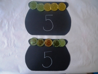 Give each child a traced pot of gold to cut out. Let each child select any combination of green and gold coins to equal 5. Have children glue their coin combinations to the tops of their pots. Once pots dry, have children compare and contrast the different ways they made 5 (i.e., two gold coins and three green coins, four green coins and one gold coin, five gold coins and zero green coins, etc.). Children can sort and graph the pots as part of the discussion.