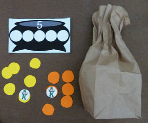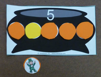 Each player gets a Pot of Gold Play Mat and a Pot of Gold Recording Sheet. Explain that the leprechaun has hidden his gold coins inside the paper bag. Taking turns and without looking, each player pulls a gold coin from the lunch bag and places it on his/her Pot of Gold Play Mat. If the player pulls out a leprechaun, he/she has to return all of his/her gold coins to the bag. The leprechaun circle will get discarded. The game ends when both players have placed 5 gold coins on their mats. Have children compare their coins (i.e., two yellow coins and three orange coins, four orange coins and one yellow coin, five yellow coins and zero orange coins, etc.).