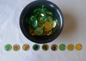 Place any leftover green and gold coins in a black plastic bowl or pot. Let children use the coins to make patterns, such as ababab, aabbaabb, abbaabba, etc. Take photographs of their completed patterns and post them in an area of the room where they can be referenced to name and copy the patterns shown.
