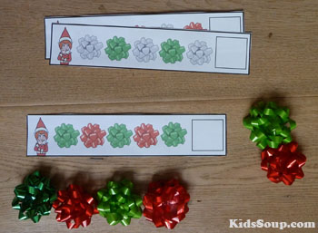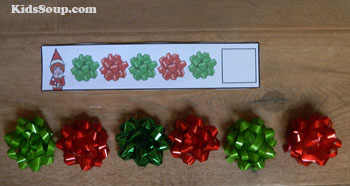 Place gift bows inside a gift bag. Let each child pull out one gift bow. Ask children to help you create an ABAB pattern with two colors. Invite a child to extend the pattern. Next, encourage children to make their own ABAB pattern. If children are familiar with ABAB pattern, create a BBAA pattern, then an ABCABC pattern together.