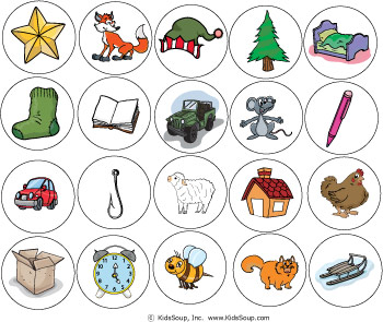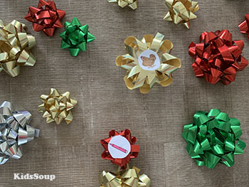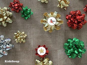 Place gift bows picture down on the table or on the floor. Taking turns, the children turn over two gift bows. If the pictures rhyme, the player gets to keep the bows. If the pictures don't rhyme, the bows get turned back over. Then the next player gets a turn.